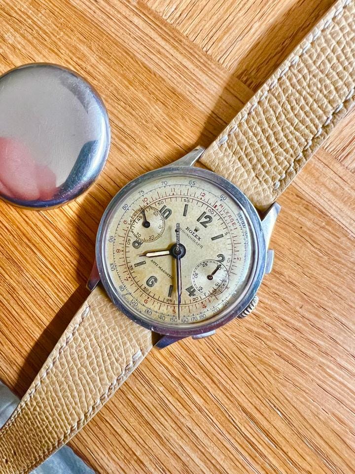 Superbo cronografo Rolex 2508, orologio intatto non lucidato, lo vedete come è uscito dalla fabbrica. Numero di serie tutto visibile nel fondello! Tutti i nostri orologi sono accompagnati da un anno di garanzia. Orologio del 1946, un esemplare incredibile di Rolex Vintage